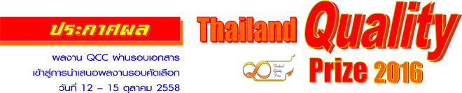 ผลงาน QCC ผ่านการพิจารณารอบเอกสาร เข้าสู่การนำเสนอผลงานรอบคัดเลือก วันที่ 12 – 15 ตุลาคม 2558 ณ โรงแรมอวานีเอเทรียม ถ.เพชรบุรีตัดใหม่ โดยมีรายละเอียดตามไฟล์แนบ ประกาศผล Thailand Quality Prize 2016 รอบเอกสาร