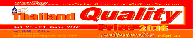ขอเชิญร่วมเป็นส่วนหนึ่งของความสาเร็จกับรางวัลคุณภาพ Thailand Quality Prize 2016 รอบชิงชนะเลิศ ครั้งที่ 33 ระหว่างวันที่ 29 – 31 มีนาคม 2559 เวลา 08.30 – 17.30 น. ณ ห้องแกรนด์ฮอลล์ ศูนย์นิทรรศการและการประชุมไบเทค บางนา, กรุงเทพ